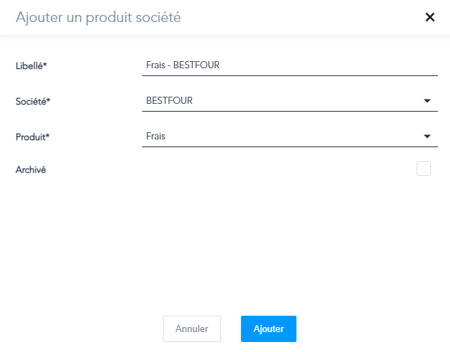 Indiquez le libellé du produit souhaité, sélectionnez la société sous-traitante associée et définissez le type de produit sur "Frais", puis cliquez sur Ajouter :