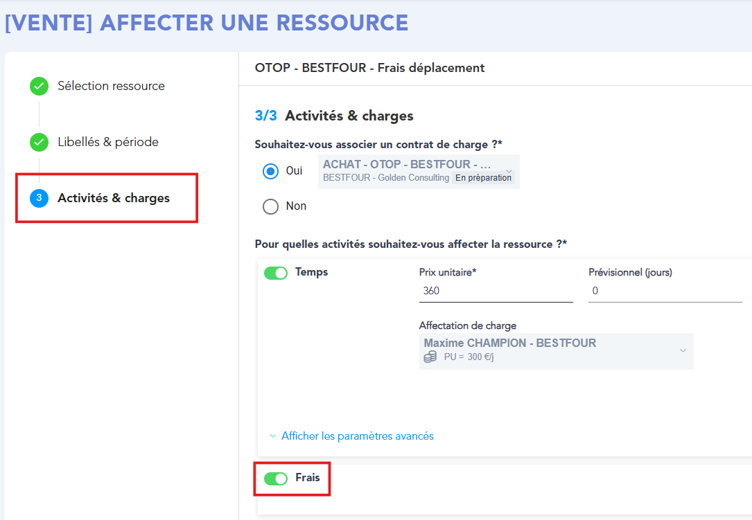Cochez la case "Frais" pour activer la déclaration dans le CRA :
