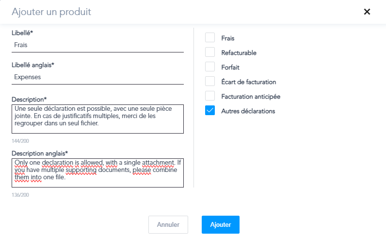 Indiquez le libellé du produit souhaité ainsi que sa description en français et en anglais, cochez l’option "Autres déclarations", puis cliquez sur Ajouter.