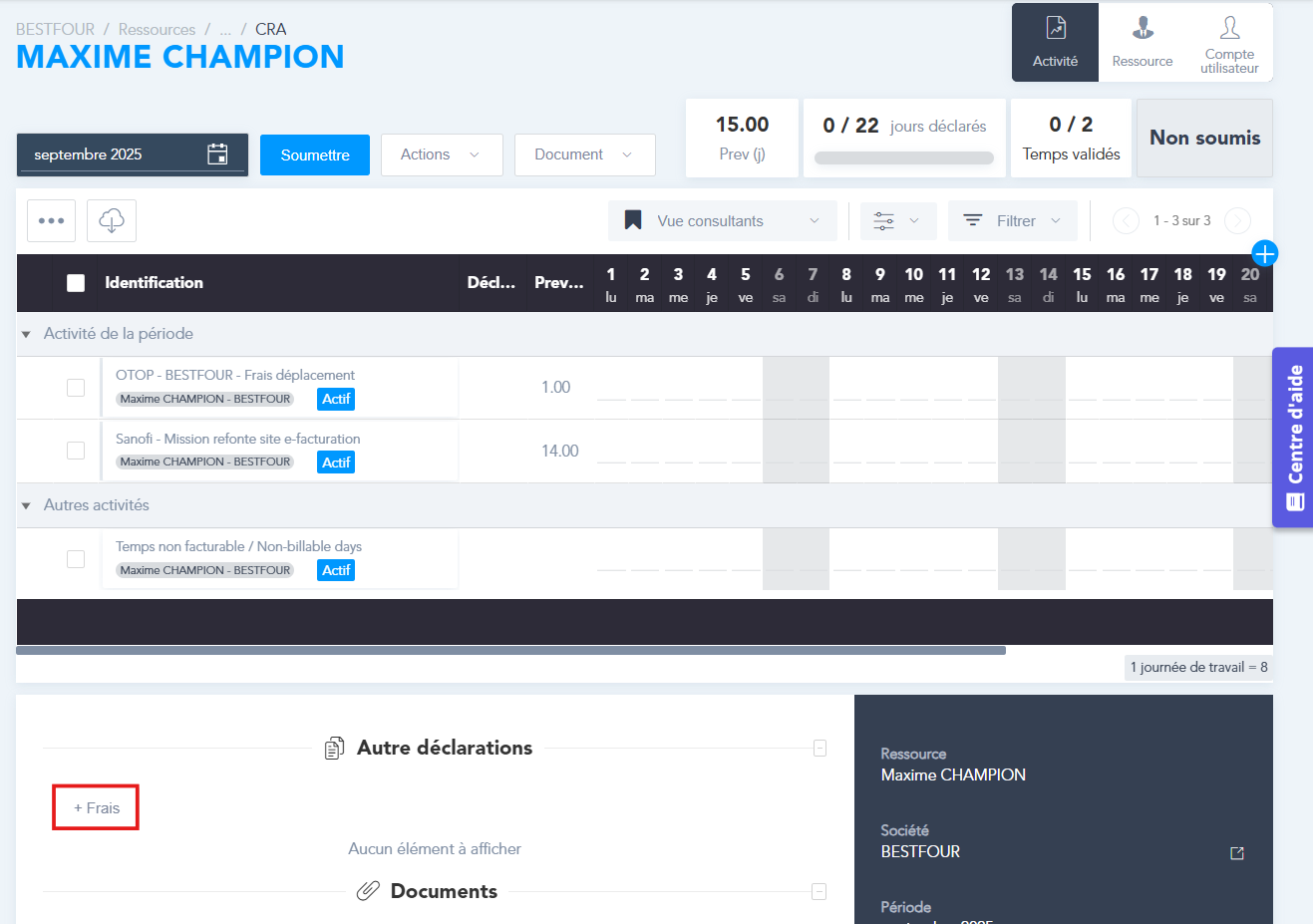 Accédez au CRA de la ressource concernée. Dans la section "Autres déclarations", cliquez sur le bouton "Frais" :