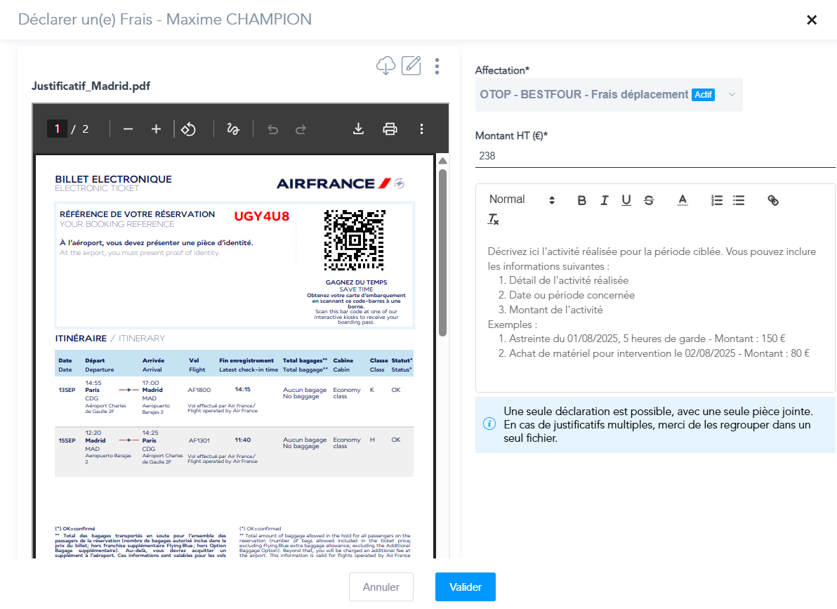 Sélectionnez la pièce jointe contenant les justificatifs fusionnés, saisissez le montant HT des frais, ajoutez un descriptif si nécessaire, puis validez :